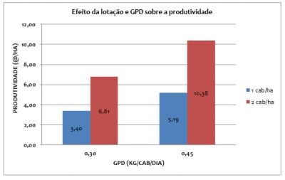 Os sistemas de produção de gado de corte brasileiro, se caracterizam pelo uso de zebuínos (nelore) e plantas forrageiras tropicais (gênero Brachiaria). Essas plantas apresentam elevada amplitude de resposta à produção (kg MS de forragem/ ha), característica que traz vantagens produtivas aos sistemas com maiores lotações, como demonstrado na figura 1, que retrata a avaliação do efeito do ganho de peso e taxa de lotação média anual sobre a produtividade por hectare, considerando 52,0% de rendimento de carcaça.