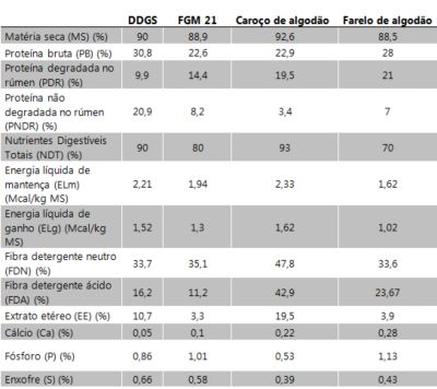 O DDG é um alimento rico em energia, proteína, extrato etéreo e enxofre (observar a tabela 1 abaixo). Uma característica importante do DDG é o alto teor de proteína não degradável no rúmen, muito superior aos outros alimentos abordados aqui, o que pode ajudar em formulações nas quais necessitamos de mais proteína metabolizável para os animais.