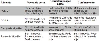 Em função do alto teor de óleo (extrato etéreo) e de enxofre, o DDG tem limitação de inclusão em dietas de bovinos de corte (ver a tabela 2). O uso de DDG para gado de corte deve observar as recomendações do National Research Council (NRC), de 2016, que estabelece os teores máximos de enxofre e extrato etéreo na dieta em 0,4% e 7,0%, respectivamente.