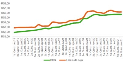 Confira, na figura 2, a evolução do preço do quilograma da proteína bruta (PB) do farelo de soja e do DDG, em reais. Com as altas de preço maiores do DDG, em comparação com o farelo, a diferença, que era de 29,2% em março de 2020, caiu para 8,1% em março deste ano.